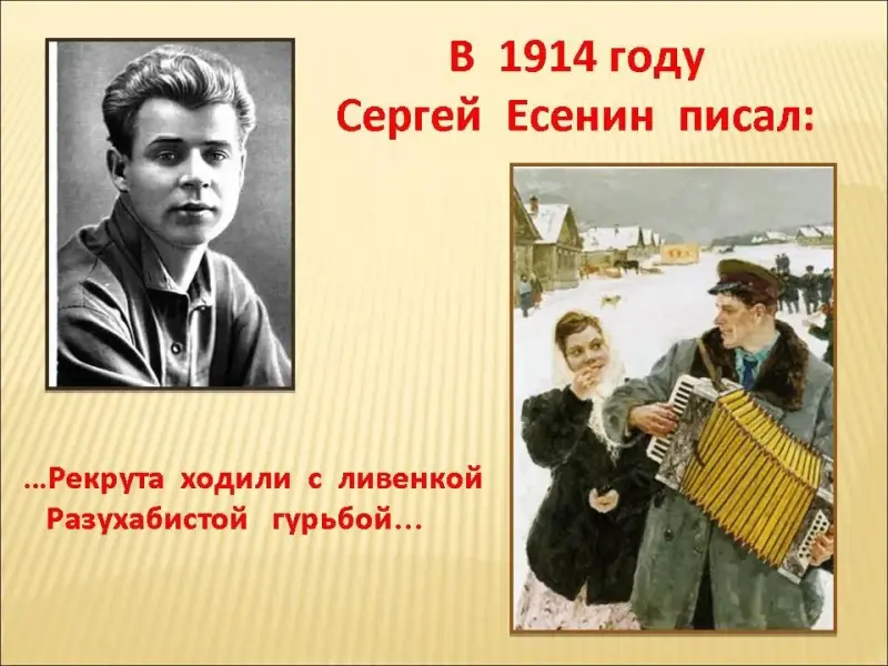 Слайд 13. О прощальных вечерах, уходивших на войну солдат, писал в 1914 году Сергей Есенин: