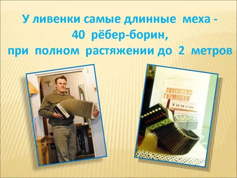 Слайд 14. У ливенки самые длинные меха. Если у других гармошек рёбер-борин 13-14, то у ливенки - 40. Такую гармошку можно буквально обмотать вокруг себя, т.к. при полном растяжении мехов ее длина достигает двух метров.