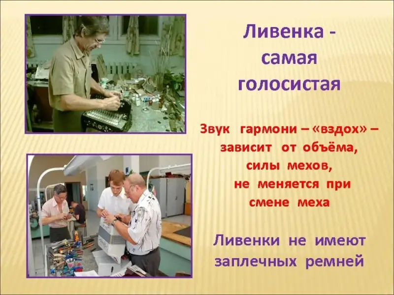 Слайд 15. Ливенская гармошка от тальянок отличается тем, что если на всех прочих требуется владение сложной техникой игры мехами, то на ливенках звук не меняется при смене меха. К тому же гармошки не имеют ремней, которые перекидываются через плечо гармониста. От объема, силы мехов зависит "вздох" - звук гармони. Поэтому не большая по размеру, но с длинными мехами ливенка, самая голосистая.