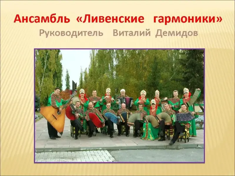 Слайд 16. В 1975 году в одной из местных орловских газет появилась заметка: "В самих Ливнах на гармониках от больших - величиной с обувную коробку, до крохотных - со спичечный коробок, играют музыканты ансамбля "Ливенские гармоники". Специальный репертуар для них пишет орловский композитор Евгений Дербенко".