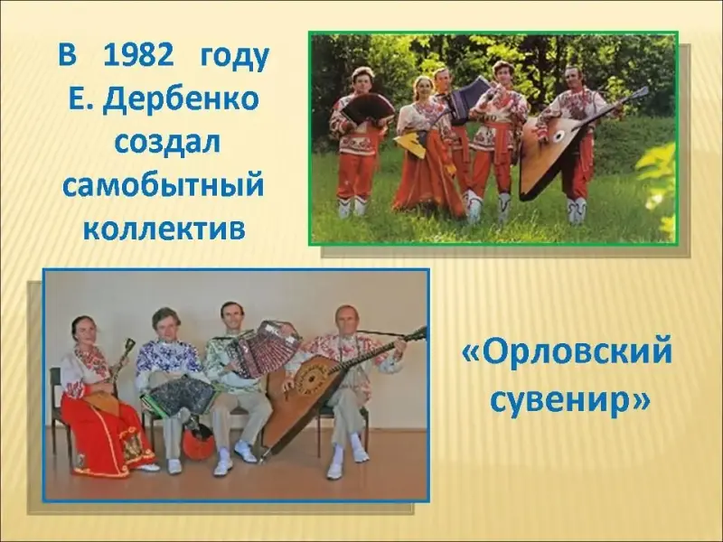Слайд 19. Увлечение ансамблевым исполнительством приводит Е. П. Дербенко к созданию в 1982 году самобытного коллектива "Орловский сувенир". Участники ансамбля, в том числе и его руководитель, играют на многочисленных русских народных инструментах, стремясь превратить каждый номер в своеобразную пьесу-сценку. Каждое выступление коллектива ансамбля является уникальным и не похожим на другие. Сценический образ и постановочное мастерство руководителя ансамбля и каждого из его членов, делают выступления интересными и насыщенными. Поэтому, где бы ни выступал этот коллектив - в нашей стране или за рубежом,- ему сопутствует неизменный успех.