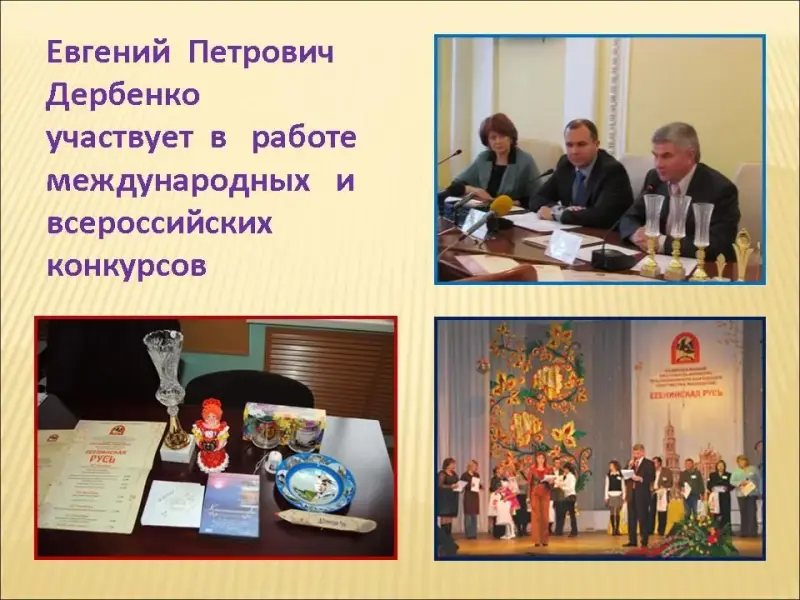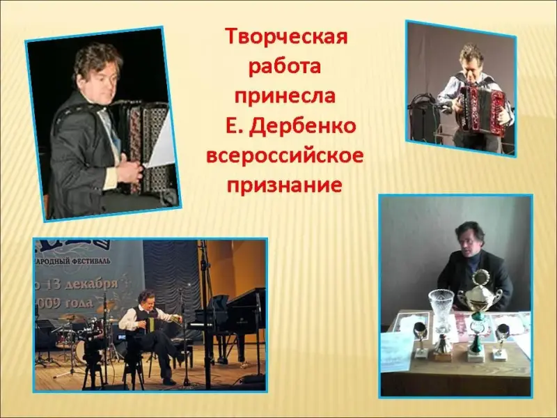 Слайд 30. В качестве председателя и члена жюри Дербенко участвовал в работе нескольких десятков международных и всероссийских конкурсов. Ежегодно в городе Рязань проходит Национальный фестиваль - конкурс традиционного народного творчества молодежи "Есенинская Русь". Он собирает на одной сцене более 400 участников из разных городов России. Председателем жюри этого фестиваля - конкурса в номинации "инструментальное исполнительство" много лет подряд является заслуженный деятель искусств России, член Союза композиторов России, педагог Евгений Петрович Дербенко. Он даёт мастер-классы и сольные концерты. В одном из интервью Евгений Петрович сказал: "Когда ребенок играет дома или для себя - он музыкант, но, выходя на сцену, он уже артист и при помощи своего музыкального инструмента должен общаться с публикой. Труд музыканта очень тяжелый. Чтобы чего-то добиться, необходим талант и стремление к мастерству".