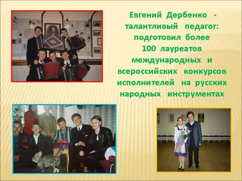 Слайд 21. Евгений Дербенко является не только известным композитором и исполнителем, но и талантливым педагогом. Он подготовил более 100 лауреатов международных и всероссийских конкурсов исполнителей на русских народных инструментах. Наиболее известные ученики Евгения Дербенко: