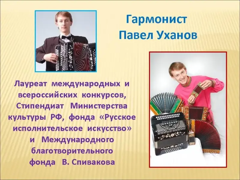 Слайд 22. Лауреат международных и всероссийских конкурсов, стипендиат Министерства культуры РФ, фонда "Русское исполнительское искусство" и Международного благотворительного фонда В.Спивакова, гармонист Павел Уханов;