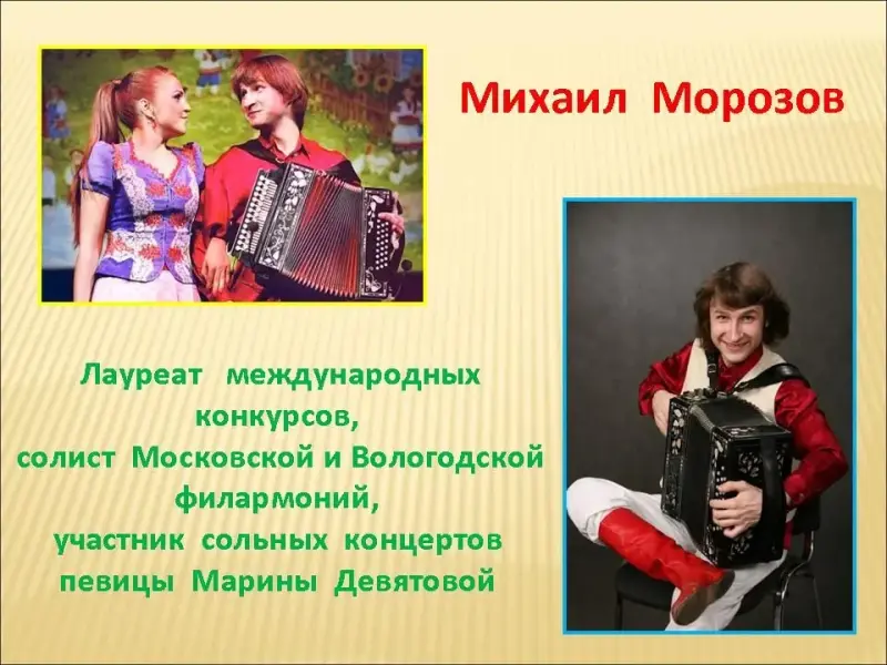 Слайд 24. Лауреат первых премий различных международных конкурсов, солист Московской и Вологодской филармоний, участник сольных концертов певицы Марины Девятовой - Михаил Морозов;