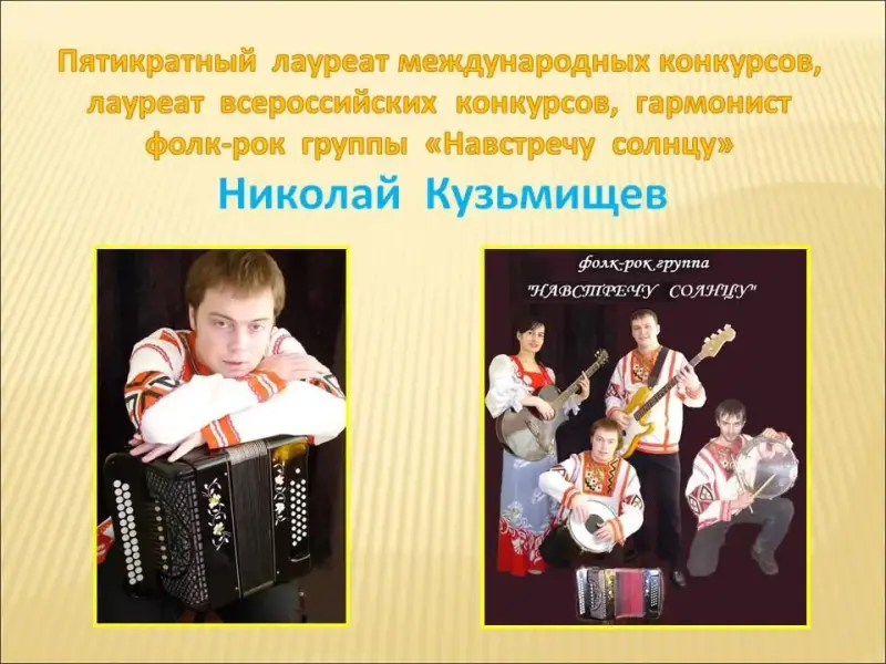 Слайд 25. Пятикратный лауреат международных конкурсов, лауреат всероссийских конкурсов, гармонист фолк-рок группы "Навстречу солнцу" - Николай Кузьмищев;