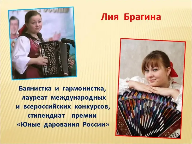 Слайд 26. Баянистка и гармонистка, лауреат международных и всероссийских конкурсов, стипендиат премии "Юные дарования России" при поддержке министерства культуры РФ - Лия Брагина;