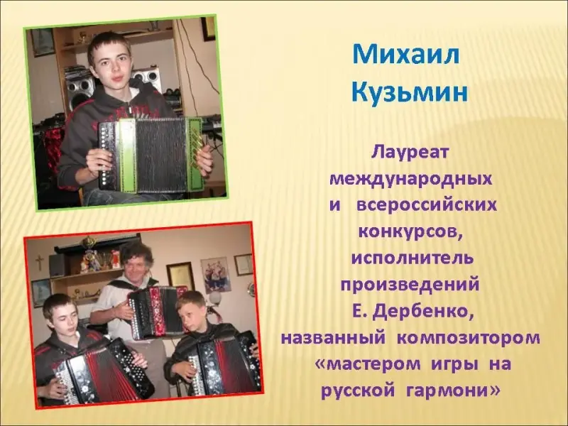 Слайд 27. Лауреат международных и всероссийских конкурсов, исполнитель произведений Е.Дербенко, названный композитором "мастером игры на русской гармони" - Михаил Кузьмин;