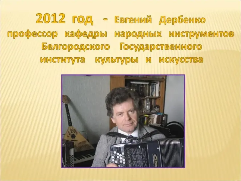 Слайд 28. С января 2012 года Дербенко - профессор кафедры народных инструментов Белгородского государственного института культуры и искусства.