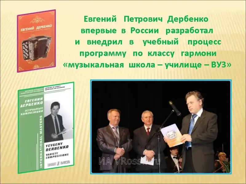 Слайд 29. Надо сказать ещё об одной заслуге Евгения Петровича Дербенко: он впервые в России разработал и внедрил в учебный процесс программу по классу гармони для музыкальных училищ. Она была одобрена Российской академией музыки имени Гнесиных и содержит трёхзвенную систему музыкального образования для гармонистов: "музыкальная школа - училище - ВУЗ". Ни один композитор фактически не писал для русской гармони. В основном гармонисты играли наигрыши, страдания, "барыню". А это, как считает Дербенко, всё равно, что играть на фортепиано один только "Собачий вальс". Дербенко стал первым профессиональным композитором, который создал огромный оригинальный репертуар для гармони - от небольших произведений-миниатюр до сонат, сюит, квартетов, концертов с оркестром. И тем самым способствовал тому, что теперь этот инструмент звучит не только на завалинках, но и в концертном зале имени Чайковского, да и в Большом зале консерватории.