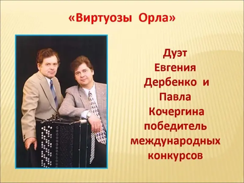 Слайд 31. С 1998 года Евгений Дербенко ведет активную концертную деятельность в дуэте с Заслуженным артистом России, руководителем Орловского трио баянистов, Анатолием Кочергиным. Репертуар ансамбля исключительно оригинален. Он состоит из обработок народных напевов, аранжировок популярных мелодий разных стран и оригинальных произведений Евгения Петровича. Дуэт принимал участие в Международных конкурсах и становился победителем, гастролировал в России и за рубежом, выпущены несколько компакт-дисков с записями. В исполнении дуэта привлекает яркая эмоциональность, импровизационность, свободное владение инструментами. Музыкантов справедливо называют "Виртуозами Орла". Они демонстрируют беспредельные возможности современных баянов и делают это артистично, легко, всегда встречая восторженный прием публики.