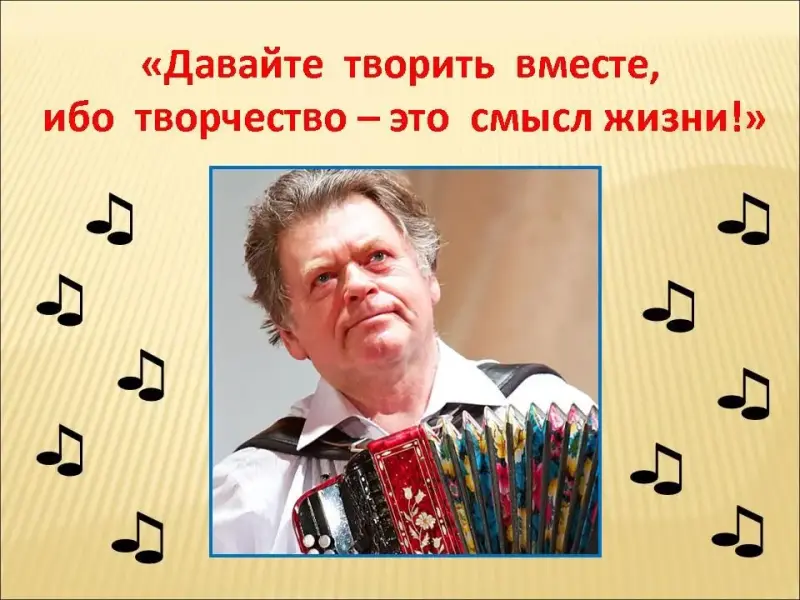 Слайд 33. Он призывает нас: "Давайте творить вместе, ибо творчество - это смысл жизни!"