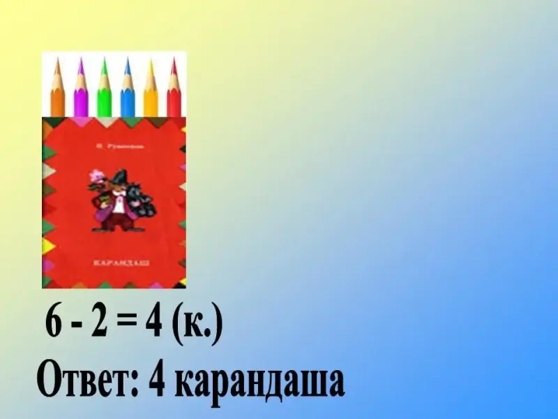 Послушайте 2 рассказа и сравните их. 1. На базе купили 2 свёклы и 1 кочан капусты. Сколько всего купили овощей? 2. На базе купили 2 свёклы и 1 кочан капусты. Овощи очень полезные. Как вы думаете, какой из этих рассказов можно поместить в учебник "математика", а какой - в учебник "окружающий мир"? Кто скажет как называется первый рассказ на языке математики? Кто уже догадался о чём пойдёт речь на уроке? Слайд 2 Что известно в задаче? Что нужно узнать? Сосчитайте сколько овощей купили? Ещё раз прочитайте вопрос и ответьте на него. Слайд 3-6 Работа по учебнику №1 (с.88). Прочитайте условие задачи. Как другими словами сказать, что такое условие задачи? Слайд 7 Прочитайте вопрос задачи. Как другими словами сказать, что такое вопрос задачи? Прочитайте решение задачи. Объясните почему задачу решили сложением. Прочитайте ответ задачи. № 2 (с. 88) Слайд 8 № 3 (с. 88) Слайд 9 Прочитайте что известно в задаче Как называется то, что вы сейчас прочитали? Прочитайте, что нужно узнать. Как называется то, что вы сейчас прочитали? Объясните решение задачи. Ответьте на вопрос задачи. |