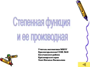 Цели: ввести понятие степенной функции, рассмотреть ее свойства, формулу производной степенной функции.