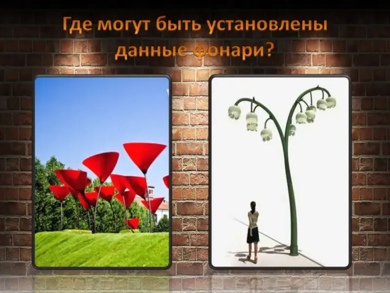 Учитель: Сегодня на уроке вам предстоит создать дизайн уличного фонаря, предназначенного для установки в определенном месте. Но прежде, чем вы приступите к работе, давайте посмотрим еще несколько слайдов. Подумайте, где, в каком месте города могли бы быть установлены изображенные на слайдах фонари?