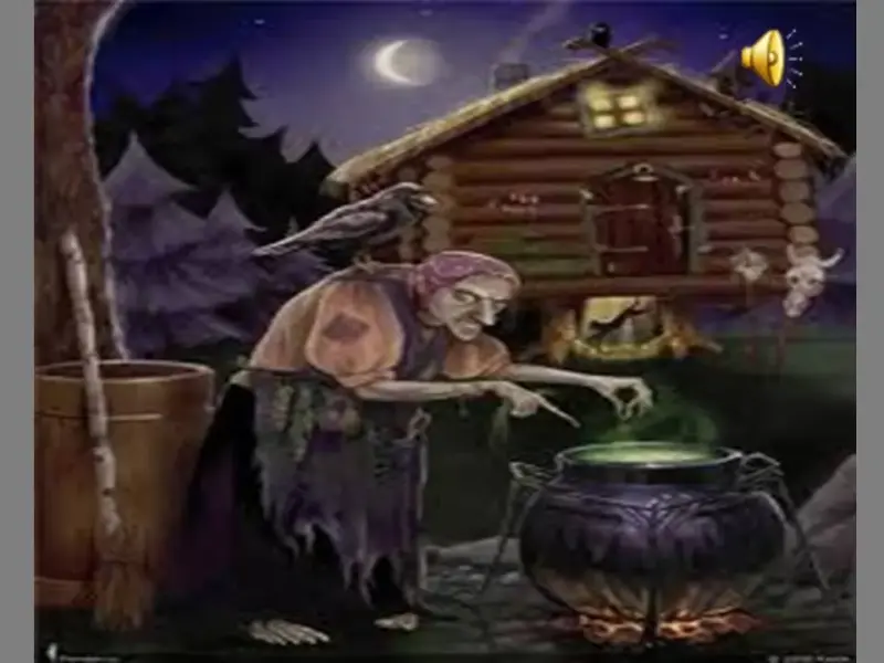 (Кощей благодарит детей. Маша и Витя идут за клубком дальше. На их пути появляется Баба-яга.)