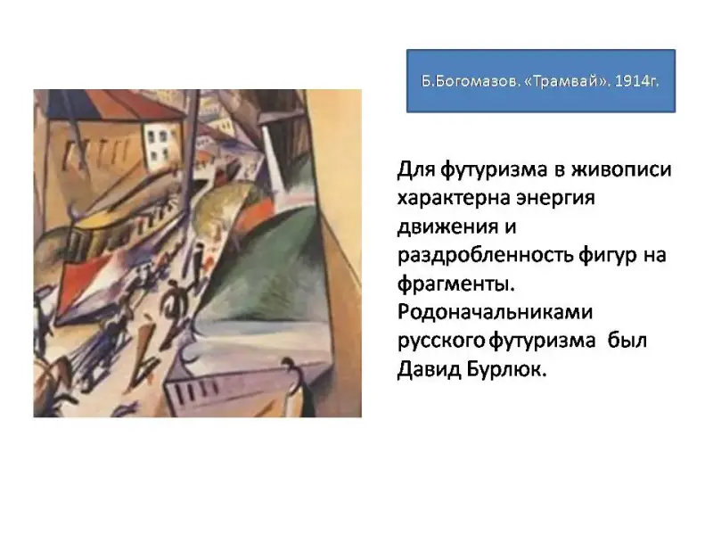 Показывает презентацию «Мастера русского авангарда», рассказывает о данном стиле.