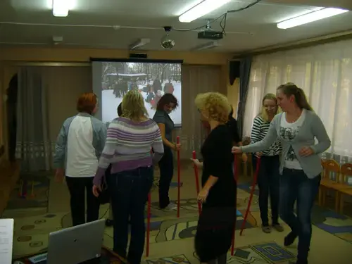 Суть упражнения заключается в том, что нам нужно взяться за и повторять некоторый текс, сопровождая его определенными движениями. Попробуем: Вперед четыре шага, Назад четыре шага, Ножками потопали, Ручками похлопали, Глазками помигали, А теперь попрыгали (вокруг себя).