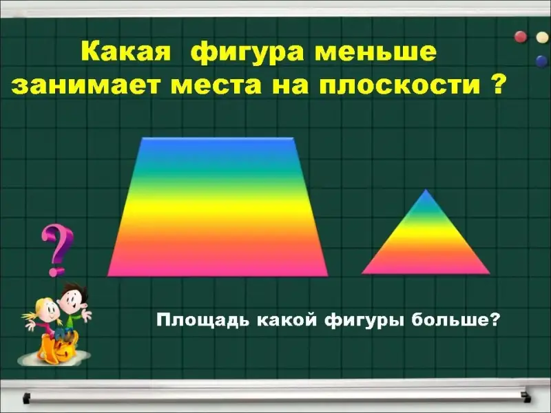 Говорят, что треугольник имеет меньшую площадь, четырёхугольник. - Площадь какой фигуры больше? Площадь - свойство фигуры, занимать место на плоскости. Площадь - это внутренняя часть фигуры. - Площадь квадрата больше, чем площадь круга?