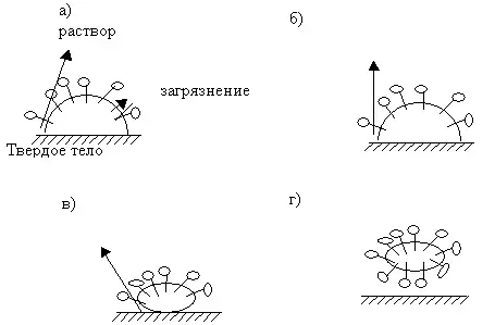 Из-за уменьшения поверхностного натяжения раствор смачивает загрязнение, проникает в трещины и поры. Капли загрязнения стягиваются, снижается сцепляемость частиц загрязнения. При механическом воздействии угол смачивания увеличивается, и в конце концов, частицы загрязнения переходят в раствор. Молекулы ПАВ адсорбируются на загрязнениях и отмытой поверхности, что препятствует укрупнению и осаждению частиц на чистой поверхности. В результате частицы загрязнителя стабилизируются во взвешенном состоянии в растворе и удаляются вместе с ним.