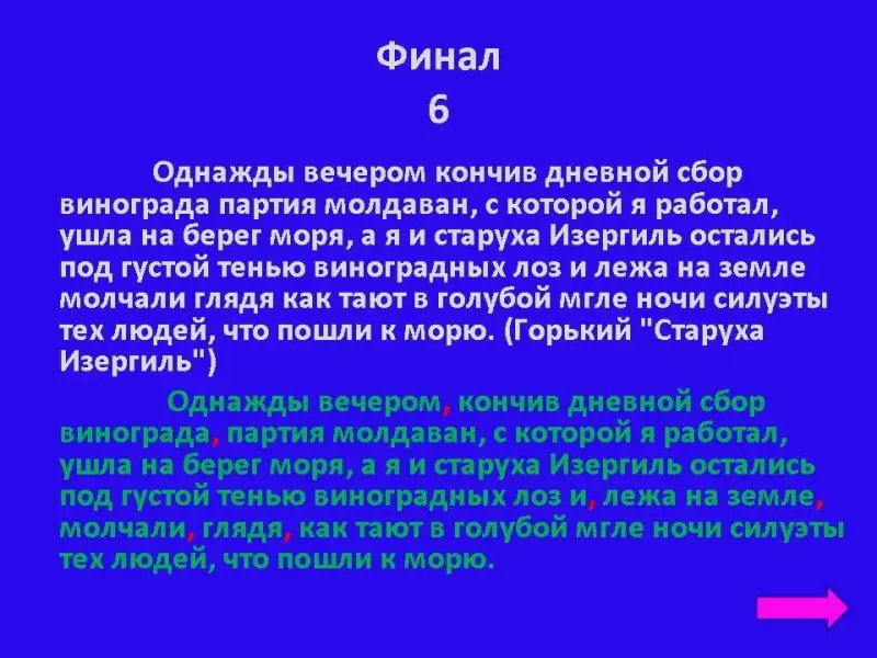 Однажды вечером кончив дневной сбор винограда партия молдаван, с которой я работал, ушла на берег моря, а я и старуха Изергиль остались под густой тенью виноградных лоз и лежа на земле молчали глядя как тают в голубой мгле ночи силуэты тех людей, что пошли к морю. (Горький "Старуха Изергиль")