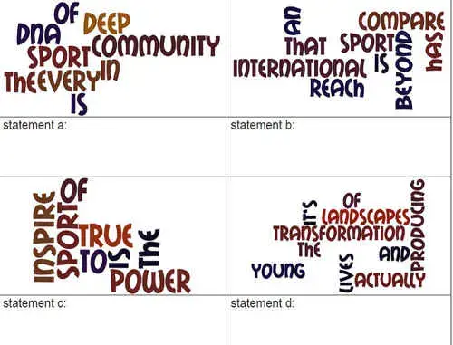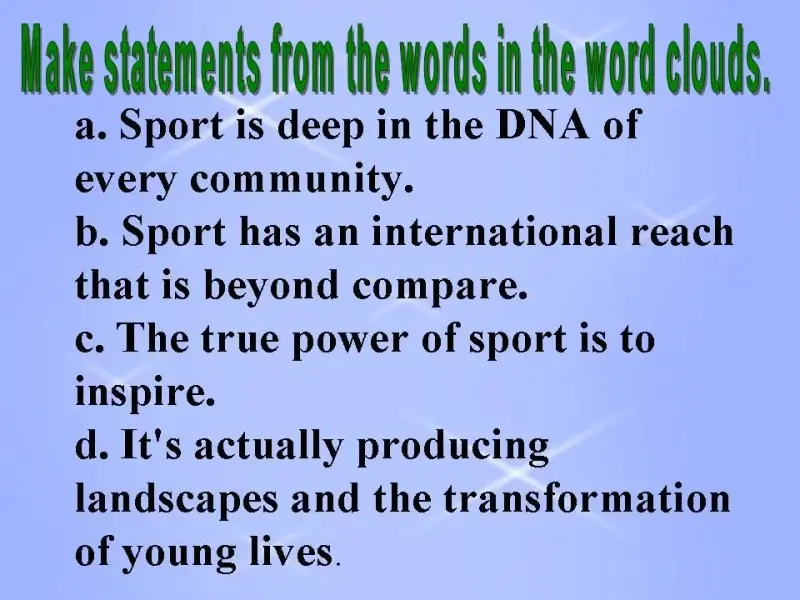 You can see four word clouds. Split into groups of four and use the words in each word cloud to make a statement about sport. Now look at the screen and check your answers.