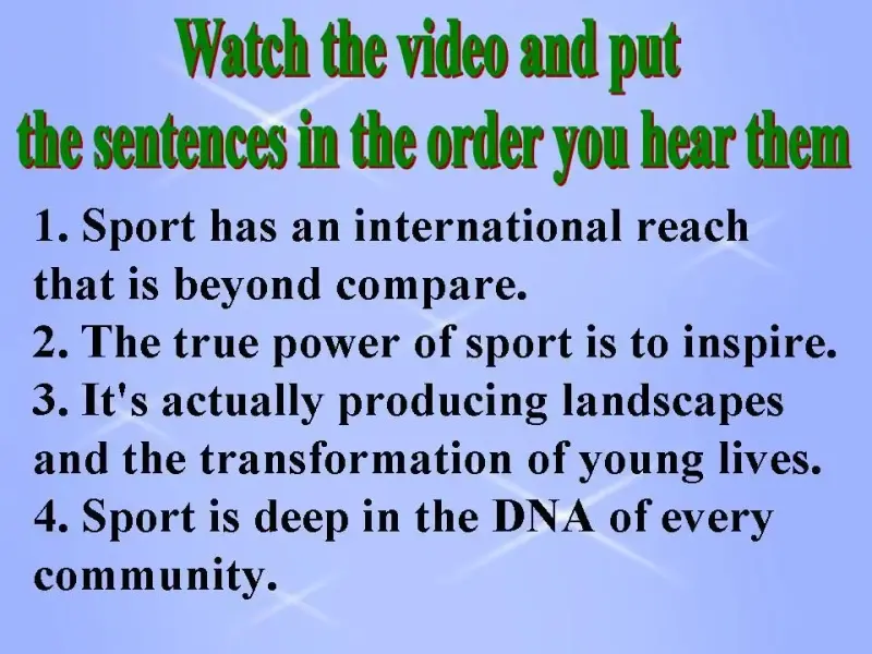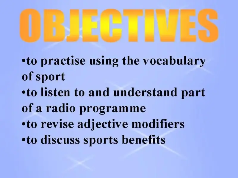 Good-morning, students. Today we are going to speak about sport and find out its place in society. First, let's read the objectives of the lesson.
