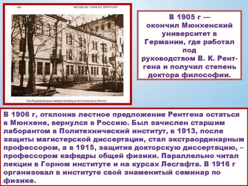 1 участник Он окончил Петроградский Политехнический институт (это было в 1918 г.) и остался работать на кафедре у профессора А. Ф. Иоффе.