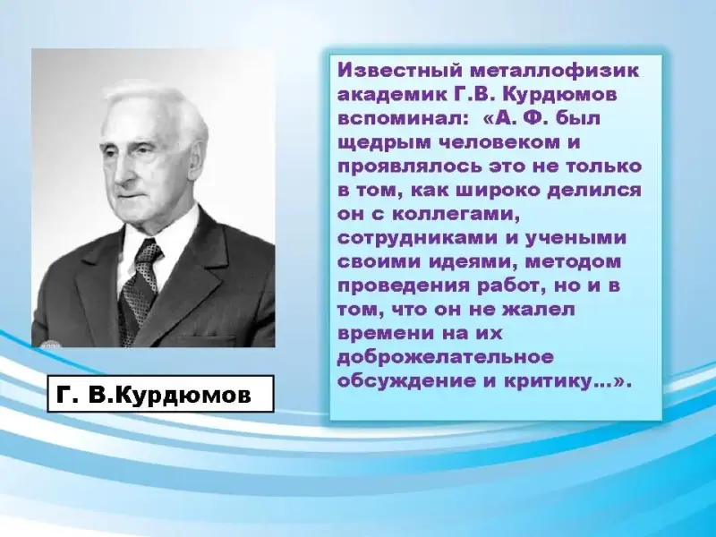2 участник - Чем же объяснить, что А. Ф. Иоффе удалось вырастить такую многочисленную плеяду видных ученых? Ответ на этот вопрос заключается в удивительном сплаве разносторонних качеств, которыми он обладал. Это доброжелательность, обостренное чувство нового, умение заинтересовать делом и способность учитывать индивидуальные наклонности каждого сотрудника, целеустремленность и оптимизм, научный талант, соединенный с широким научным кругозором, и глубокая интеллигентность..