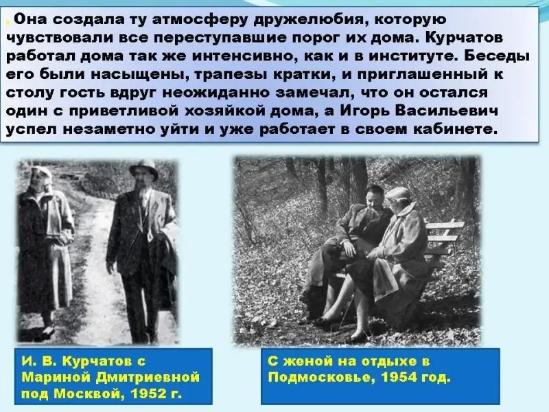 1 участник С 1943 г. Игорь Васильевич возглавлял в СССР исследования по овладению ядерной энергией. Занимаясь этой проблемой, - её называли "урановой" И.В. Курчатов жил на территории института. С утра до ночи работает в кабинете и лабораториях....В праздники с утра Игорь Васильевич одевается, предупреждает Марину Дмитриевну:- Пойду, прогуляюсь по территории. Походит по аллеям - и в лабораторию...