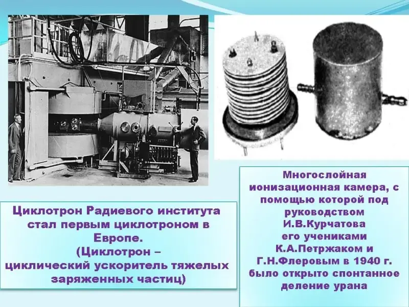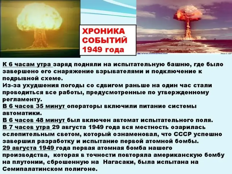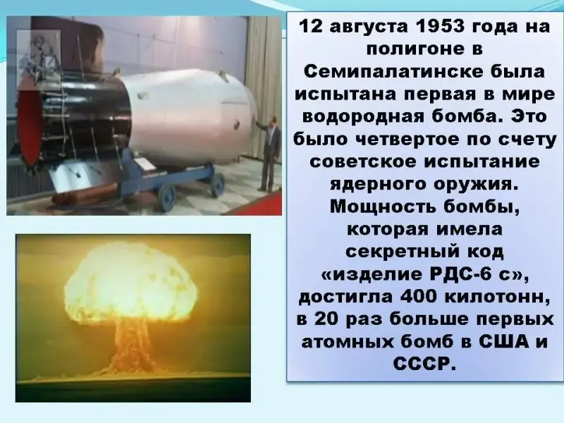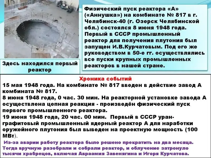 1 участник Под руководством И. В. Курчатова был сооружен первый советский уран-графитовый атомный реактор (1946 г.), построена первая в мире промышленная АЭС (1954 г.) и крупнейшая установка по исследованию термоядерных реакций. По заданию советского правительства в годы Великой Отечественной войны И. В. Курчатов начал работать над созданием нового вида оружия, и возглавляемый им коллектив создал его - атомную бомбу (1949 г.) и водородную (1953 г.)... Тогда многие в СССР считали, что это необходимо для могущества страны, ее престижа, дела мира, победы социализма и предупреждения новой войны. Презентация 2 (Слайды 30-34)