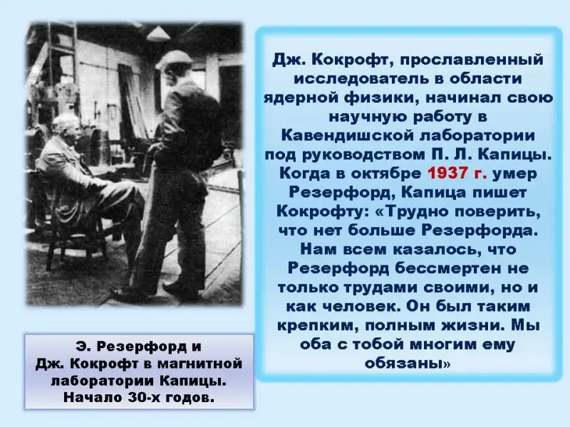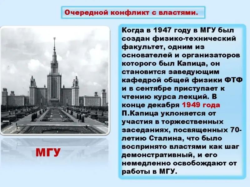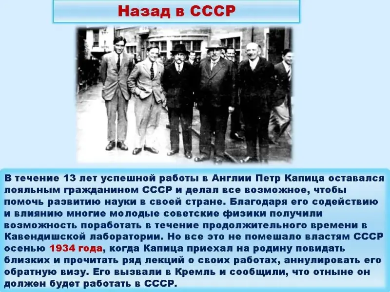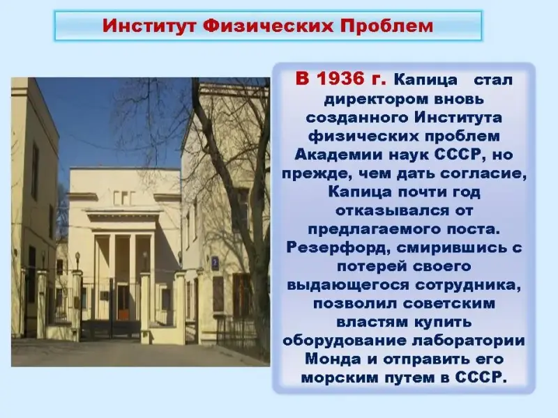 1 участник В сентябре 1934 г. решением Политбюро ВКП(б) П. Л. Капице не разрешили вновь выехать в Англию для продолжения работ в Кембридже. Вести дальше исследования в области сильных магнитных полей и низких температур он не мог: для этого ему было необходимо сложнейшее оборудование и работники очень высокой квалификации, чего в Москве не было. В знак протеста он прекращает свои физические исследования. Власть вынуждена была уступить, и закупила все научное оборудование его Кембриджской лаборатории. В Москве был создан Институт физических проблем, директором которого назначен П. Л. Капица.