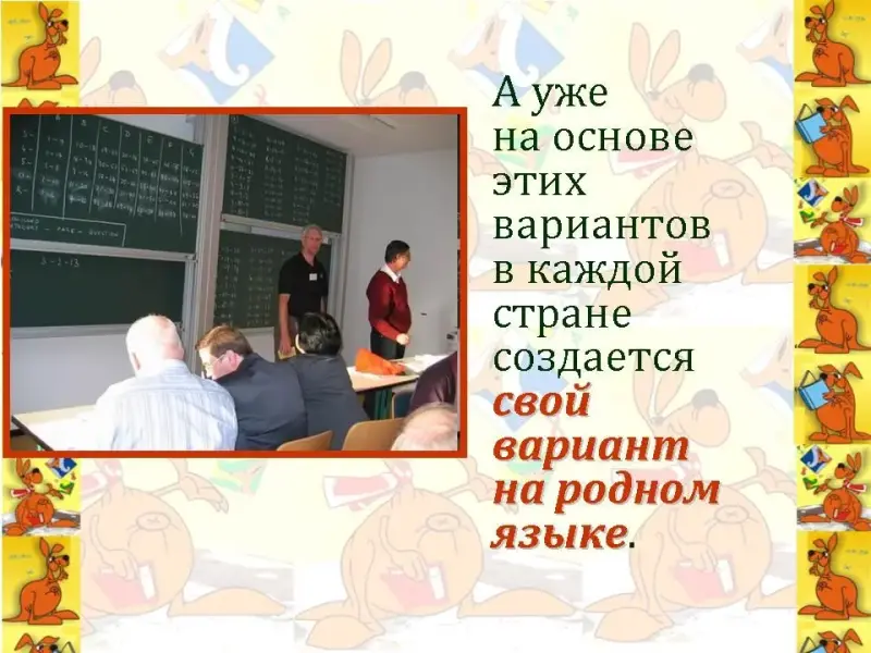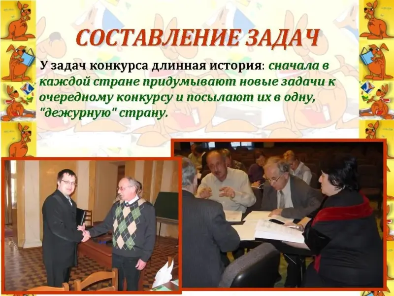 Чтец 1. Как организовывается конкурс "КЕНГУРУ"? (Слайд 10)У задач конкурса длинная история: сначала в каждой стране придумывают новые задачи к очередному конкурсу и посылают их в одну, "дежурную" страну. (Слайд 11)