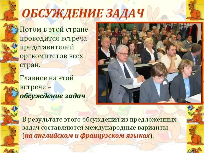 Чтец 1. Главное на этой встрече - обсуждение задач. В результате этого обсуждения из предложенных задач составляются международные варианты (на английском и французском языках). (Слайд 12)
