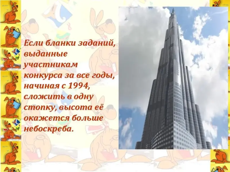 Чтец 1. Если бланки заданий, выданные участникам конкурса за все годы, начиная с 1994, сложить в одну стопку, высота её окажется больше небоскреба. (Слайд 19)