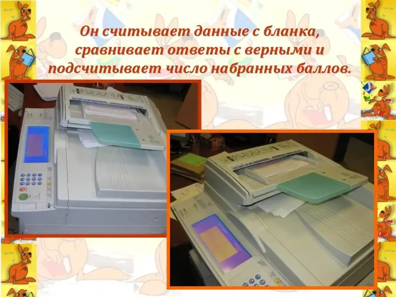 Чтец 2. Он считывает данные с бланка, сравнивает ответы с верными и подсчитывает число набранных баллов. (Слайд 22)