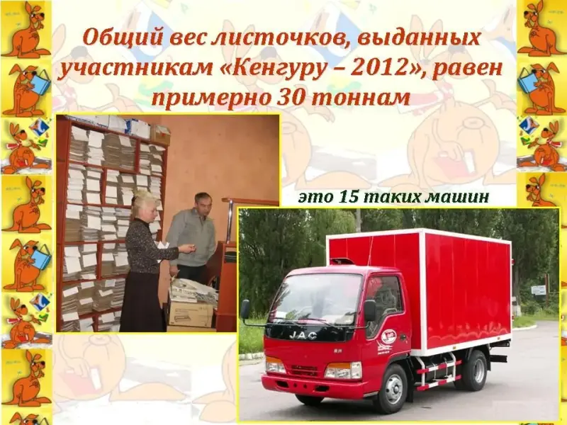 Чтец 1. Общий вес листочков, выданных участникам "Кенгуру - 2012", равен примерно 30 тоннам. (Слайд 21)