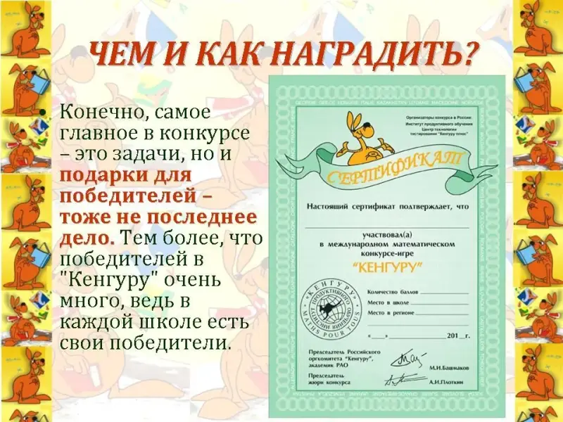 Кенгуру. Пятерку за участие в конкурсе действительно не поставят, но зато все участники получат сертификаты, а победители - подарки.