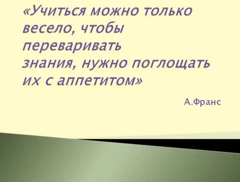 Проверяю готовность учащихся к уроку, отмечаю отсутствующих на уроке. Ребята, Французский писатель 19 века А.Франс однажды заметил " Учиться можно только весело, чтобы переваривать знания, нужно поглощать их с аппетитом". Так давайте на нашем уроке следовать совету, писателя и переваривать знания с большим аппетитом, ведь они пригодятся в нашей жизни.