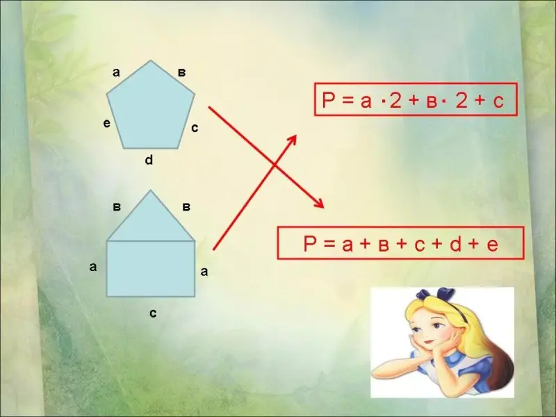 Учитель: Алиса измеряла периметр пятиугольников. Она обозначили стороны буквами и написали формулы. Вот что у неё получилось. Соедините формулу нахождения периметра с изображением фигуры.
