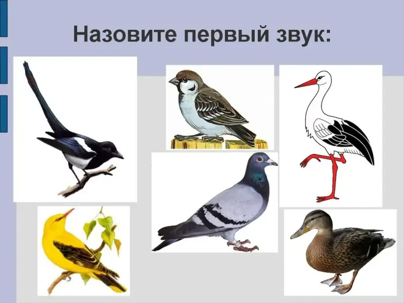 - Ребята, сейчас я покажу картинки, а вы назовите первый звук: сорока, воробей, аист, голубь, иволга, утка. ([ c ], [ в ], [ а ], [ г ], [ и ], [ у ]). Слайд 2.