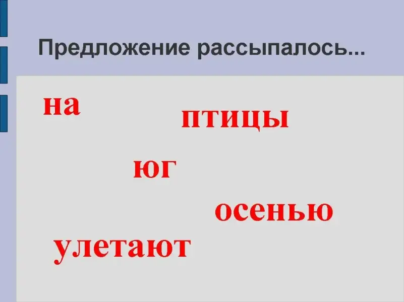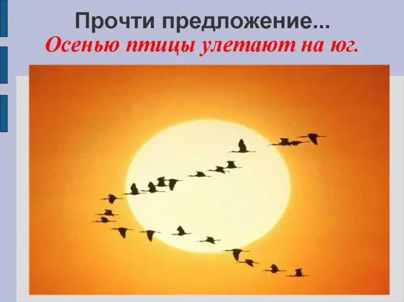 Запишите предложение. (Запись предложения в тетради и на доске.) Без какого слова смысл предложения понятен? (Без слова осенью, на юг) Правильно. Остаются слова - птицы улетают.