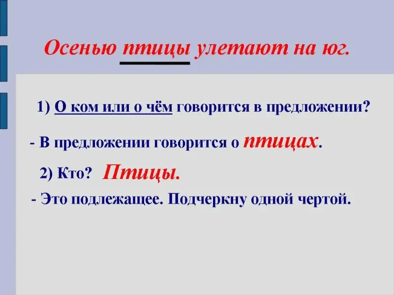 О ком или о чём говорится в предложении? В предложении говориться о птицах. Кто? Птицы - это подлежащее, подчеркну одной чертой. Слайд 7.