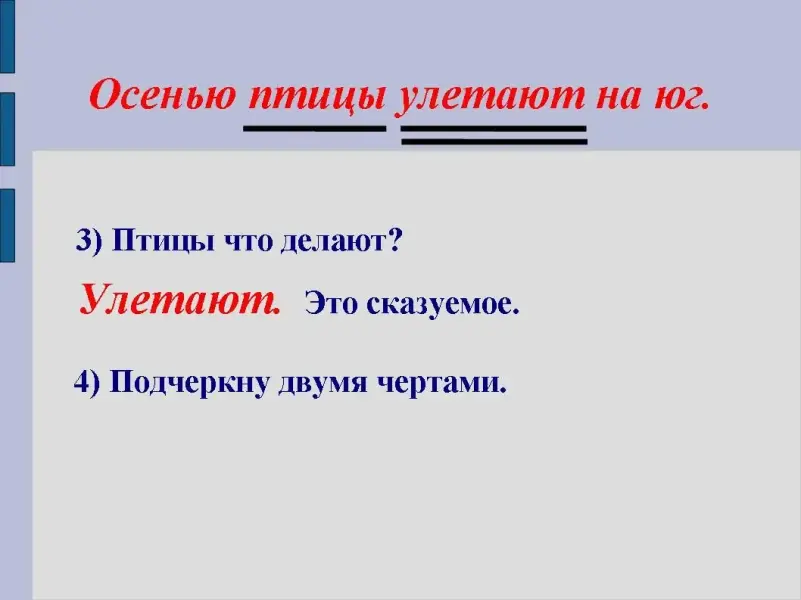 Птицы, что делают? Улетают - это сказуемое, подчеркну двумя чертами. Слайд 8.