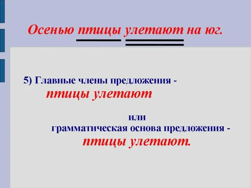 Главные члены предложения - птицы улетают. Или говорят грамматическая основа - птицы улетают. Слайд 9.