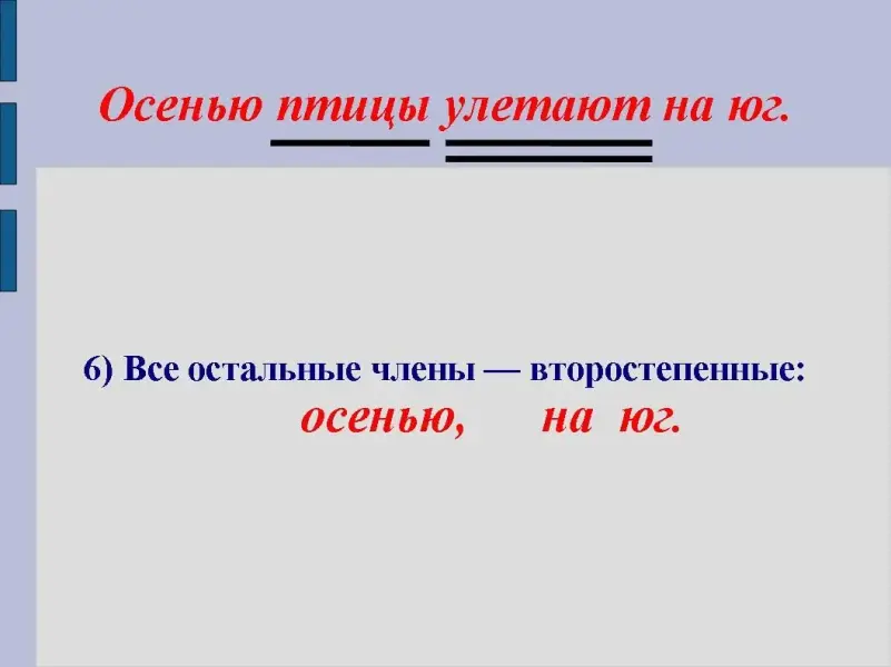 Все остальные члены предложения - второстепенные - осенью, на юг. Слайд 10.