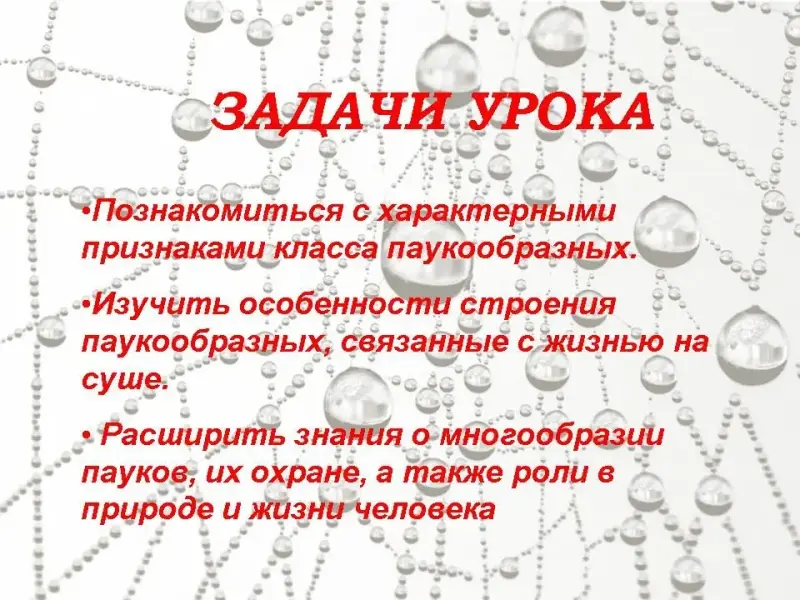 - обеспечить в ходе урока знание учащимися отличительных признаков класса паукообразные, показать значение пауков в природе и жизни человека.