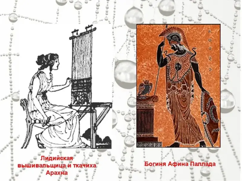 В те далекие времена в Лидии жила Арахна - дочка красильщика пурпуром Идмана. Славилась она тем, что не было равных ей в искусстве плести узорчатые ткани и ткать ковры. Вскоре Арахна возомнила себя равной богам, равной солнцу.