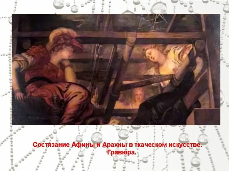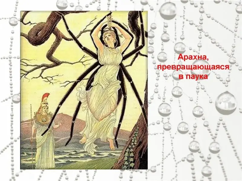 Арахна выткала ткань не хуже Афины. Но та в наказание за дерзость состязаться с богами не признала ее достоинств и наказала Арахну за гордость и тщеславие.