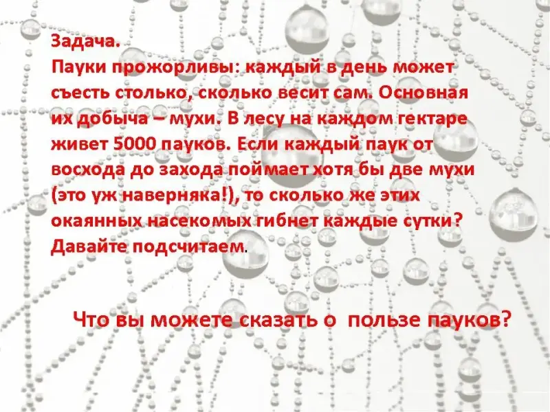 Пауки прожорливы: каждый в день может съесть столько, сколько весит сам. Основная их добыча - мухи. В лесу на каждом гектаре живет 5000 пауков. Если каждый паук от восхода до захода поймает хотя бы две мухи (это уж наверняка!), то сколько же этих окаянных насекомых гибнет каждые сутки? Давайте подсчитаем.